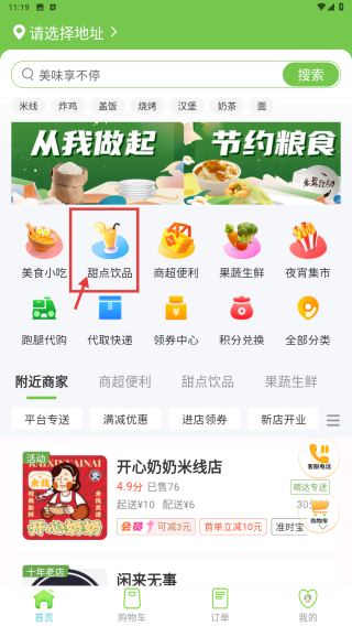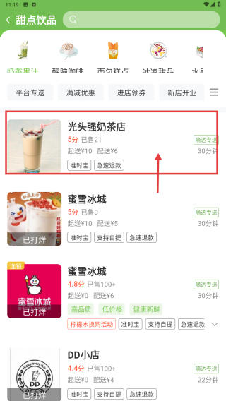 1、打開外賣類應(yīng)用,點擊甜點飲品分類,進入甜點飲品商品頁面。