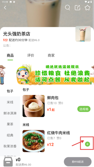 3、在店鋪商品列表里,找到紅燒牛肉米線商品,點擊添加按鈕將其加入購物車。