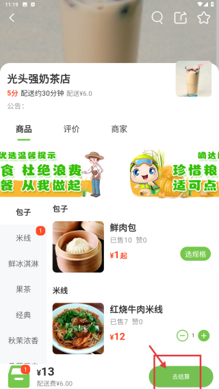2、在甜點飲品商品頁面,點擊光頭強奶茶店條目,進入店鋪商品列表頁面。