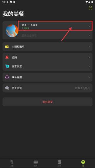 2、在我的美餐頁面,點(diǎn)擊賬號區(qū)域,進(jìn)入個人賬號信息頁面。