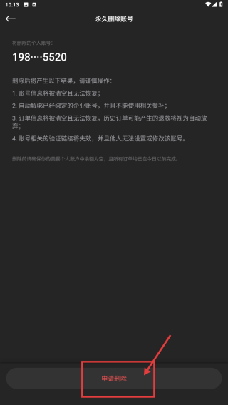 4、在永久刪除賬號頁面,點(diǎn)擊申請刪除按鈕,提交賬號刪除申請。