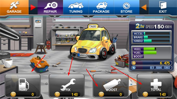 4、進(jìn)入車庫界面,利用金幣進(jìn)行車輛維修、加油或升級(jí),增強(qiáng)車輛性能。