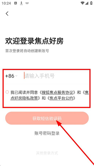 3、在登錄頁面,輸入手機號,點擊獲取短信驗證碼。