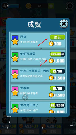 3、完成成就任務(wù)如對(duì)僵尸造成傷害、拯救幸存者等,獲取金幣獎(jiǎng)勵(lì)。