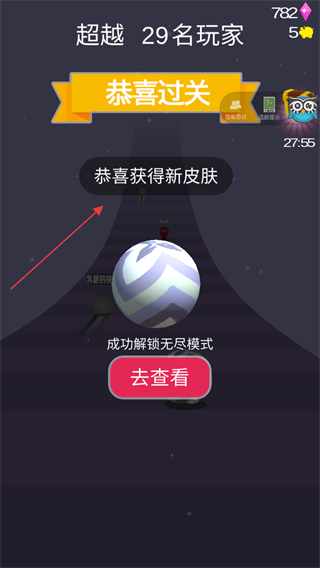 4、當小球安全到達終點,則為過關(guān),會隨機獲得皮膚或金幣獎勵。