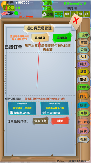 3、在貿(mào)易管理中,選擇直接出貨,領(lǐng)取訂單任務(wù),如采集塑料杯、木床等。