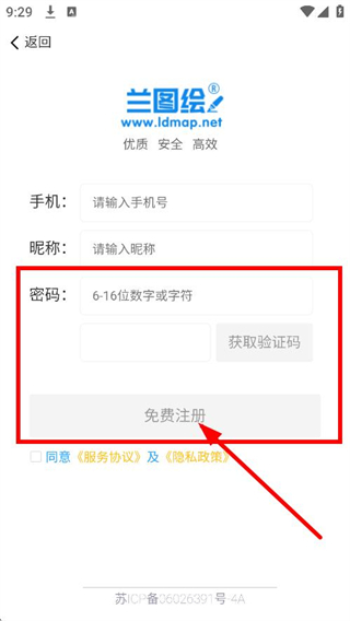 4、在注冊(cè)頁(yè)面,設(shè)置密碼,點(diǎn)擊免費(fèi)注冊(cè),完成賬號(hào)注冊(cè)操作。
