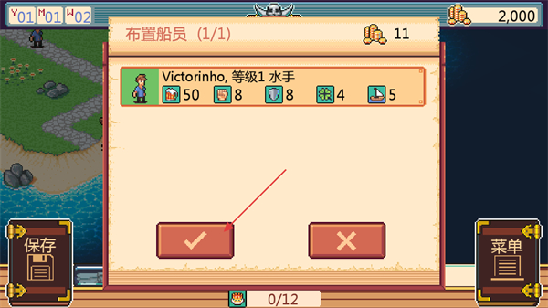 3、布置船員,選擇合適的船員如等級1的水手Victorninho,點(diǎn)擊確認(rèn)完成船員布置。