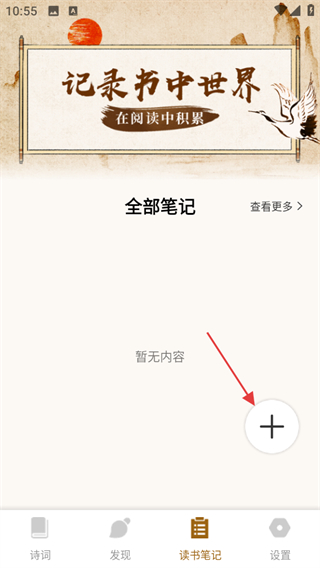2、在讀書筆記頁面,點(diǎn)擊+按鈕可進(jìn)入新建筆記頁面。
