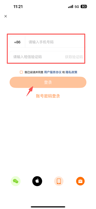 4、在該頁面輸入手機號碼,獲取并輸入短信驗證碼,勾選同意用戶服務協(xié)議和隱私政策后,點擊登錄按鈕,完成賬號登錄操作。
