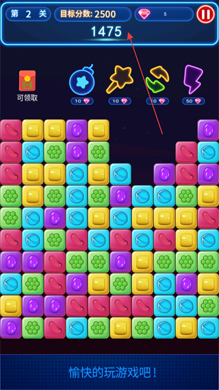 1、明確每關(guān)的目標(biāo)分?jǐn)?shù),如第二關(guān)目標(biāo)分?jǐn)?shù)為2500分,持續(xù)消除方塊積累分?jǐn)?shù)。