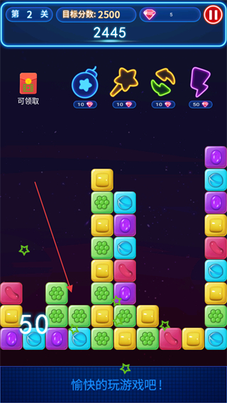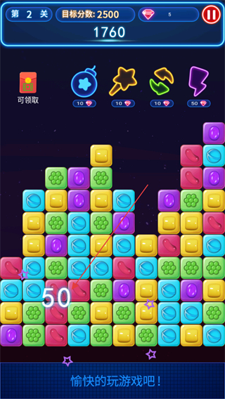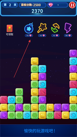 3、合理使用道具,如炸彈道具消耗10鉆石,可幫助快速消除大量方塊,提升得分效率。