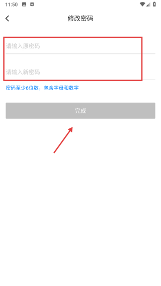 4、在修改密碼頁(yè)面,輸入原密碼和新密碼密碼至少6位數(shù),包含字母和數(shù)字,點(diǎn)擊完成按鈕,完成密碼修改操作。