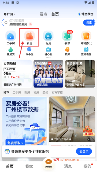 1、打開房產(chǎn)APP首頁,點擊新房選項,進入貝殼新房板塊頁面。