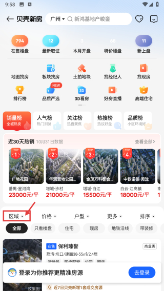 2、在貝殼新房頁面,點擊區(qū)域選項,進入?yún)^(qū)域篩選界面。