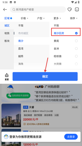 3、在區(qū)域篩選界面,選擇南沙區(qū)府區(qū)域,點擊確定按鈕完成區(qū)域篩選。