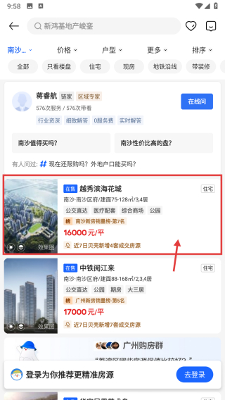 4、在篩選后的房源列表中,點擊越秀濱?;ǔ欠吭礂l目,進入房源詳情頁。