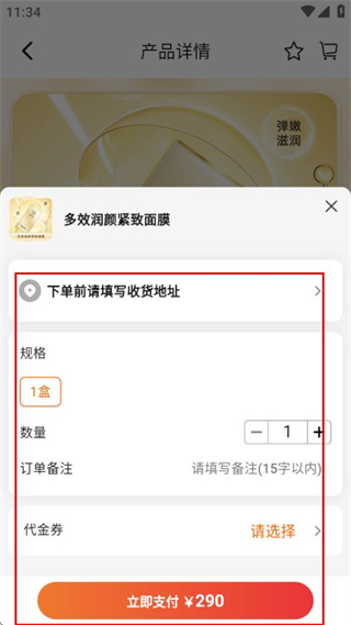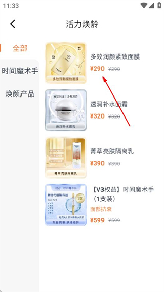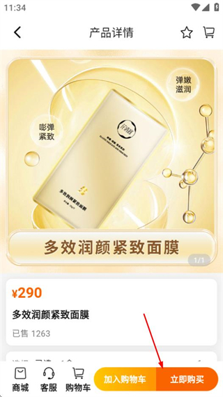 2、在商品列表頁(yè)面,點(diǎn)擊心儀商品如多效潤(rùn)顏緊致面膜可進(jìn)入該商品詳情頁(yè)面。