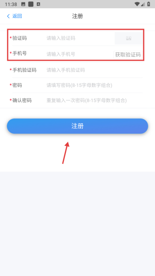 4、在注冊頁面,填寫驗證碼、手機號、手機驗證碼及密碼,點擊注冊按鈕,完成賬號注冊操作。