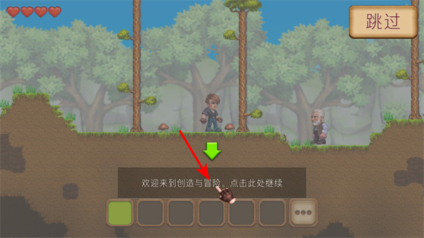 1、在游戲初始劇情界面,點(diǎn)擊提示區(qū)域可繼續(xù)推進(jìn)劇情,了解創(chuàng)造與冒險(xiǎn)的背景,若想快速進(jìn)入游戲,也可點(diǎn)擊按鍵直接開(kāi)始游戲。