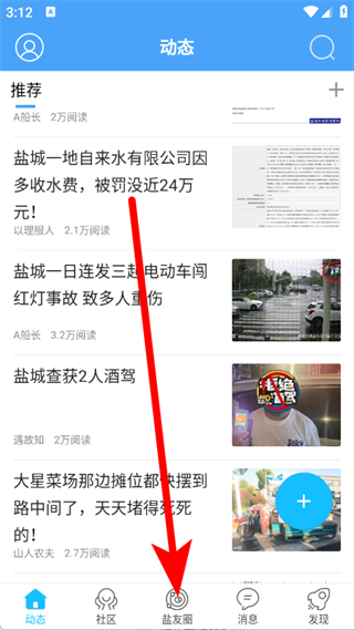 1、打開(kāi)鹽城123網(wǎng),點(diǎn)擊底部鹽友圈,進(jìn)入鹽友圈頁(yè)面。