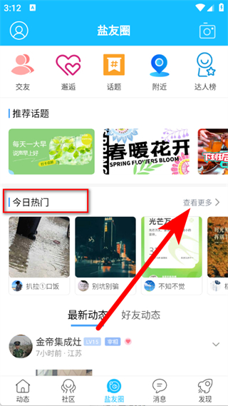2、在鹽友圈頁(yè)面,找到今日熱門(mén)板塊,點(diǎn)擊查看更多。