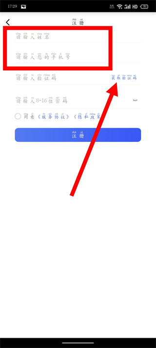 3、輸入姓名、手機(jī)號(hào)碼,點(diǎn)擊獲取驗(yàn)證碼。