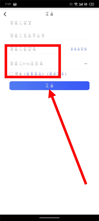 4、輸入收到的短信驗(yàn)證碼,設(shè)置8-16位密碼,勾選后,點(diǎn)擊注冊(cè)按鈕。