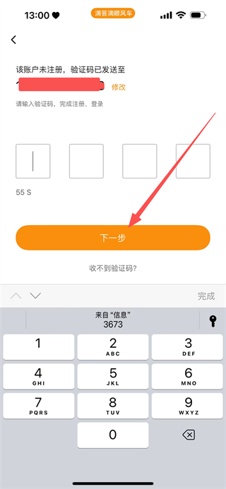 3、在驗(yàn)證碼輸入頁(yè)面,輸入短信驗(yàn)證碼后點(diǎn)擊下一步。
