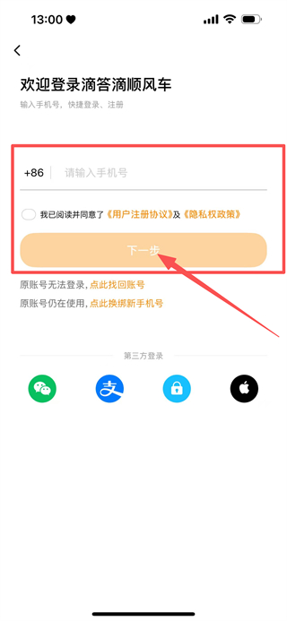 2、在登錄頁(yè)面,輸入手機(jī)號(hào),勾選同意后點(diǎn)擊下一步。
