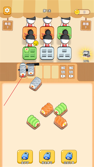 核心操作僅需點(diǎn)擊屏幕,將相同種類壽司歸類拼接成完整拼盤(pán)即可消除,關(guān)卡目標(biāo)明確,完成全部同種類組裝就能通關(guān),上手即能享受消除樂(lè)趣。