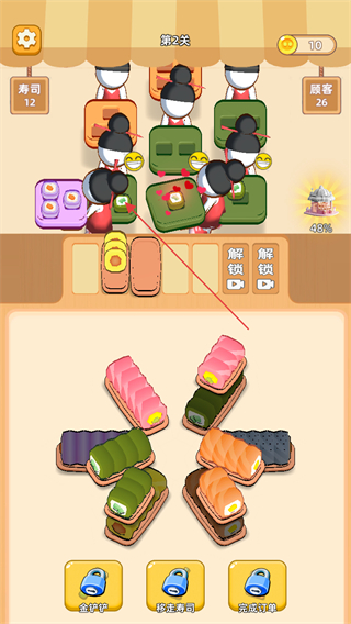 1、在下方壽司堆放處可以點(diǎn)擊壽司放入上方的托盤(pán)空位中,被壓住的壽司是無(wú)法被點(diǎn)擊的。