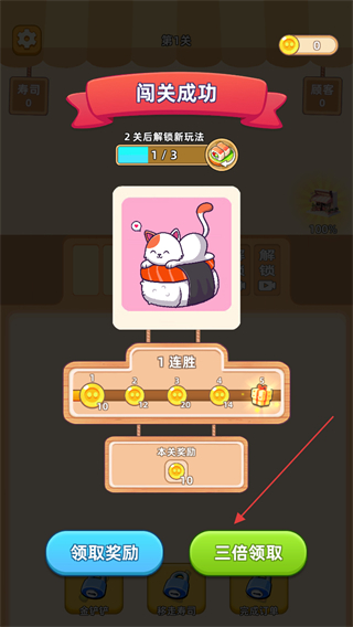 4、闖關(guān)成功后,會(huì)積累連勝獎(jiǎng)勵(lì)以及金幣獎(jiǎng)勵(lì),點(diǎn)擊三倍獎(jiǎng)勵(lì)可以通過(guò)觀看視頻獲取。
