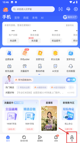 1、打開電信服務(wù)類APP首頁,點(diǎn)擊底部我選項(xiàng),進(jìn)入個(gè)人中心頁面。