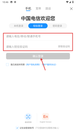 4、在短信登錄頁面,填寫手機(jī)號(hào)、獲取并輸入短信驗(yàn)證碼,勾選同意用戶服務(wù)協(xié)議后,點(diǎn)擊確認(rèn)登錄按鈕,完成賬號(hào)登錄操作。