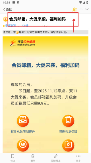 4、在郵件詳情頁,即可查看該郵件的詳細內容如雙11會員郵箱福利活動等信息。