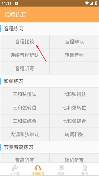 2、在視唱練耳頁面,點擊音程比較,進入音程比較練習頁面。