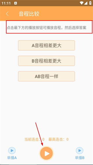 3、在音程比較練習頁面,點擊播放按鈕播放音程,然后根據(jù)聽辨選擇答案。