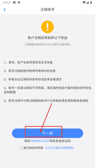 4、在注銷須知頁面,仔細閱讀賬號注銷后放棄的權(quán)益及風險提示,點擊下一步按鈕,完成賬號注銷操作。