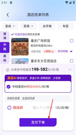 2、在酒店搶單列表頁面,選擇心儀酒店后點(diǎn)擊支付下單,進(jìn)入訂單支付頁面。
