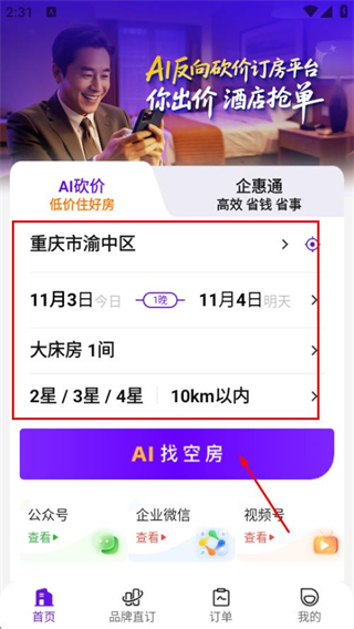 流程簡化為兩步,確定入住需求與篩選條件后,選擇AI砍價(jià)或自主出價(jià)模式提交即可,無需復(fù)雜操作,新手也能快速上手完成預(yù)訂。