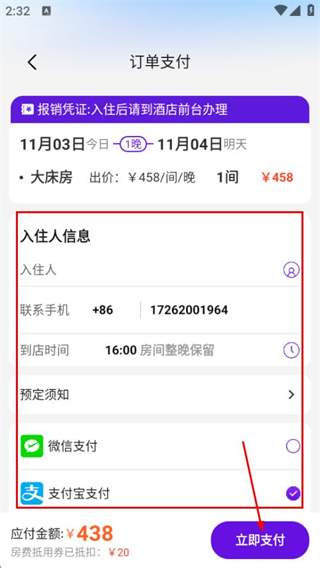 3、填寫信息,選擇支付方式后點(diǎn)擊立即支付,完成酒店預(yù)訂支付。