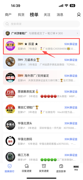 2、在榜單頁面,點擊TOP1的辰星商家條目,進(jìn)入商家店鋪頁面。