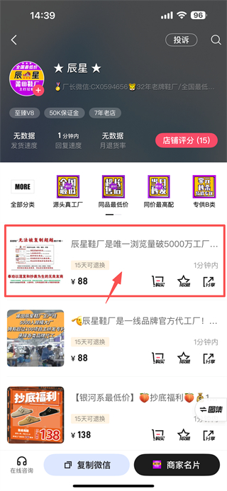 3、在商家店鋪頁面,點擊辰星鞋廠是唯一瀏覽量破5000萬工廠商品條目,進(jìn)入商品詳情頁面。