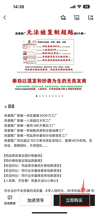 4、在商品詳情頁面,點擊立即購買按鈕,即可完成該商品的選購操作。