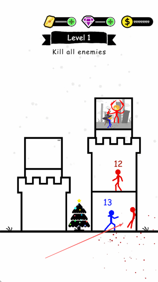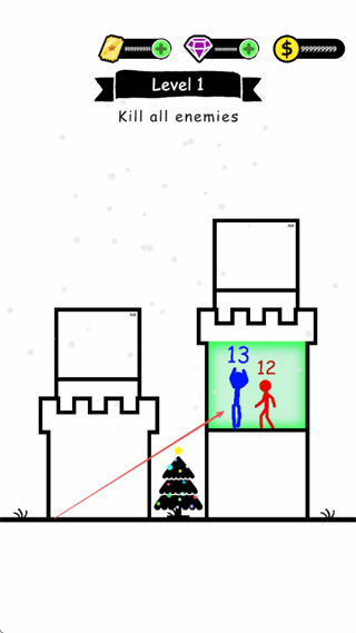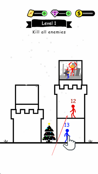 1、在Level1中,目標是消滅所有敵人,點擊藍色火柴人,使其移動到敵人所在的樓層。
