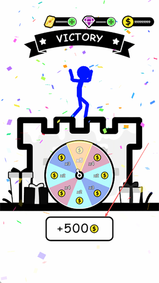 4、通關后獲得金幣獎勵,可參與轉(zhuǎn)盤抽獎或直接領取+500$的獎勵,繼續(xù)挑戰(zhàn)下一關。