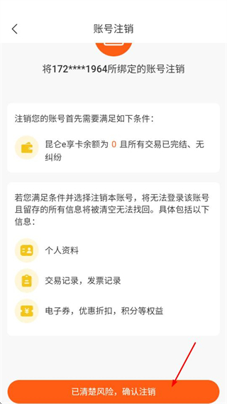 5、在賬號注銷頁面,點(diǎn)擊已清楚風(fēng)險(xiǎn),確認(rèn)注銷按鈕,即可注銷賬號。