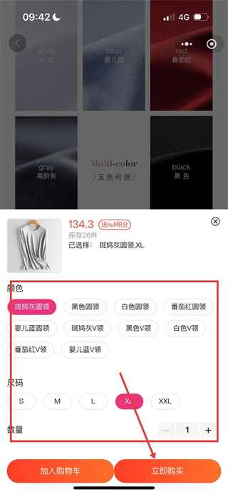 3、在商品詳情頁,點擊立即購買按鈕,進入規(guī)格選擇頁面。
