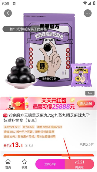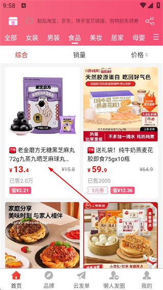 2、在食品商品頁面,選擇老金磨方無糖黑芝麻丸商品,進入其詳情頁。